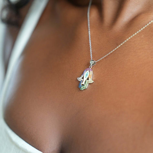 Accent your wardrobe with the '925 Silver Multi-Color CZ Evil Eye Hamsa Pendant Necklace 18".' This vibrant piece combines the protective Hamsa hand with the colorful evil eye, offering a fashionable way to carry a symbol of protection every day.