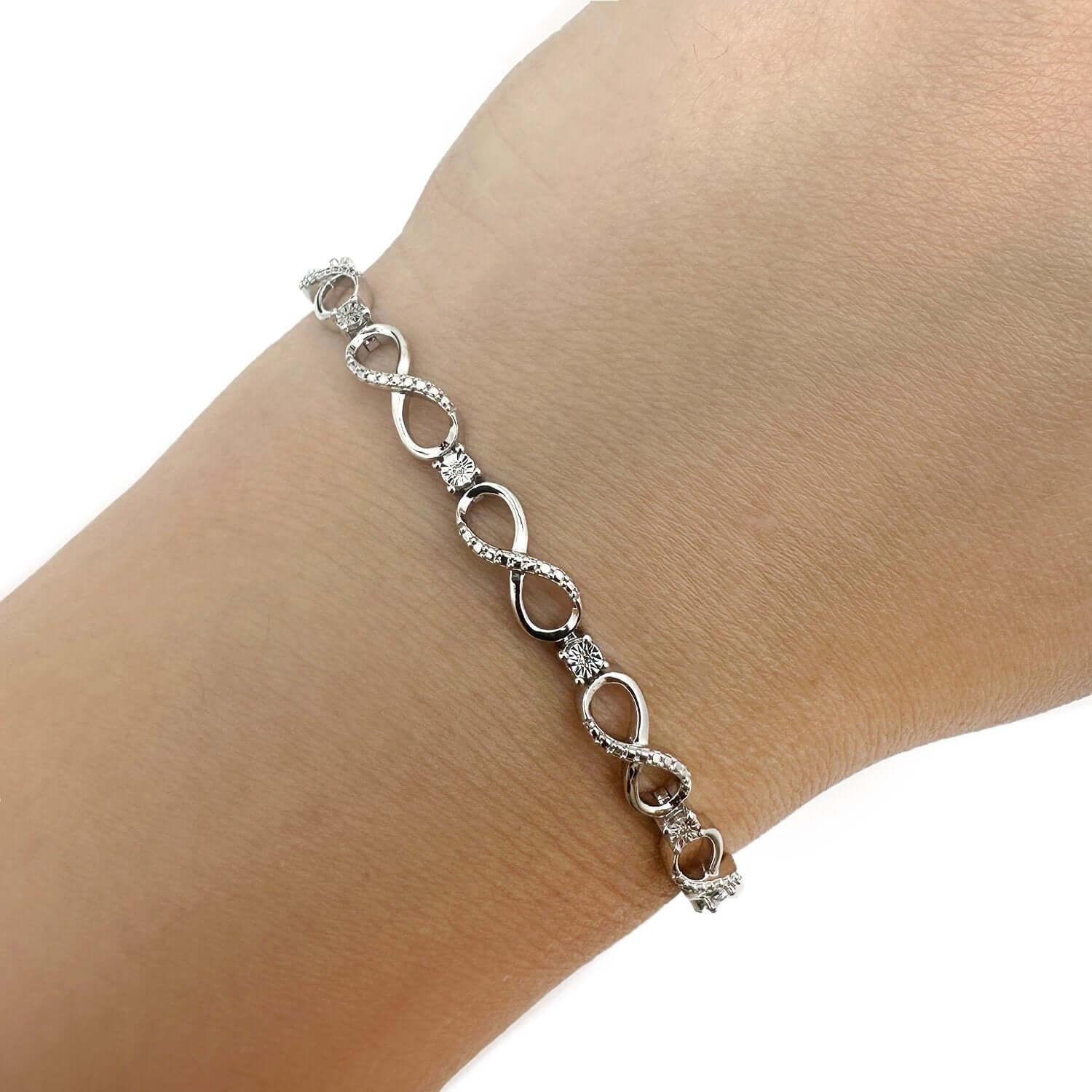 Embrace eternal elegance with our 0.03CTW natural diamond infinity bracelet. Crafted in sterling silver, this bracelet features 5mm infinity symbols partially adorned with shimmering diamonds, while larger accent diamonds separate each link. Measuring 7" in length, it offers a graceful balance of brilliance and symbolism, capturing timeless love and beauty in every detail.