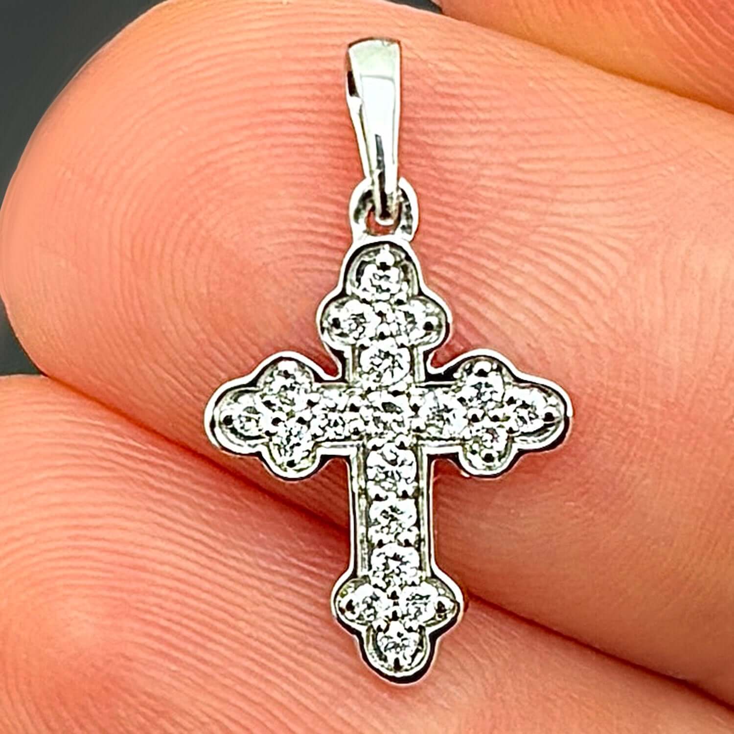 A petite yet radiant cross pendant available in your choice of 10K yellow, white, or rose gold. This elegant piece features 0.12CTW of natural diamonds in a classic pavé setting, showcasing brilliant round-cut stones with G-H color and I2 clarity. The pendant measures 0.75" in height and has a bail clearance of 2mm, making it perfect for dainty chains. Please note: This pendant does not come with a chain. It fits chains up to 2mm in width. Please check your chain’s size or explore our collection of compatible chains.