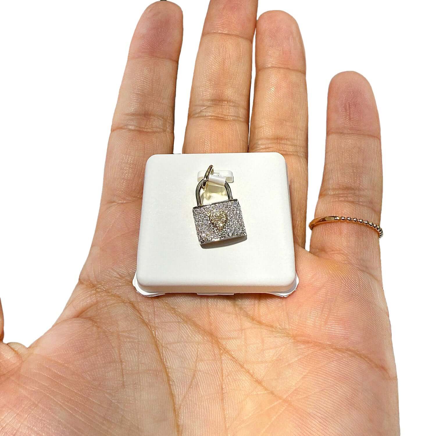 Secure your style with this elegant 10K two-tone gold lock pendant, featuring a heart accent adorned with 0.25Ctw of natural diamonds. The high-polished finish and pavé setting add a radiant touch to this unique design. Measuring 0.65" in height and 12mm in width, it is perfect for pairing with your favorite chain.