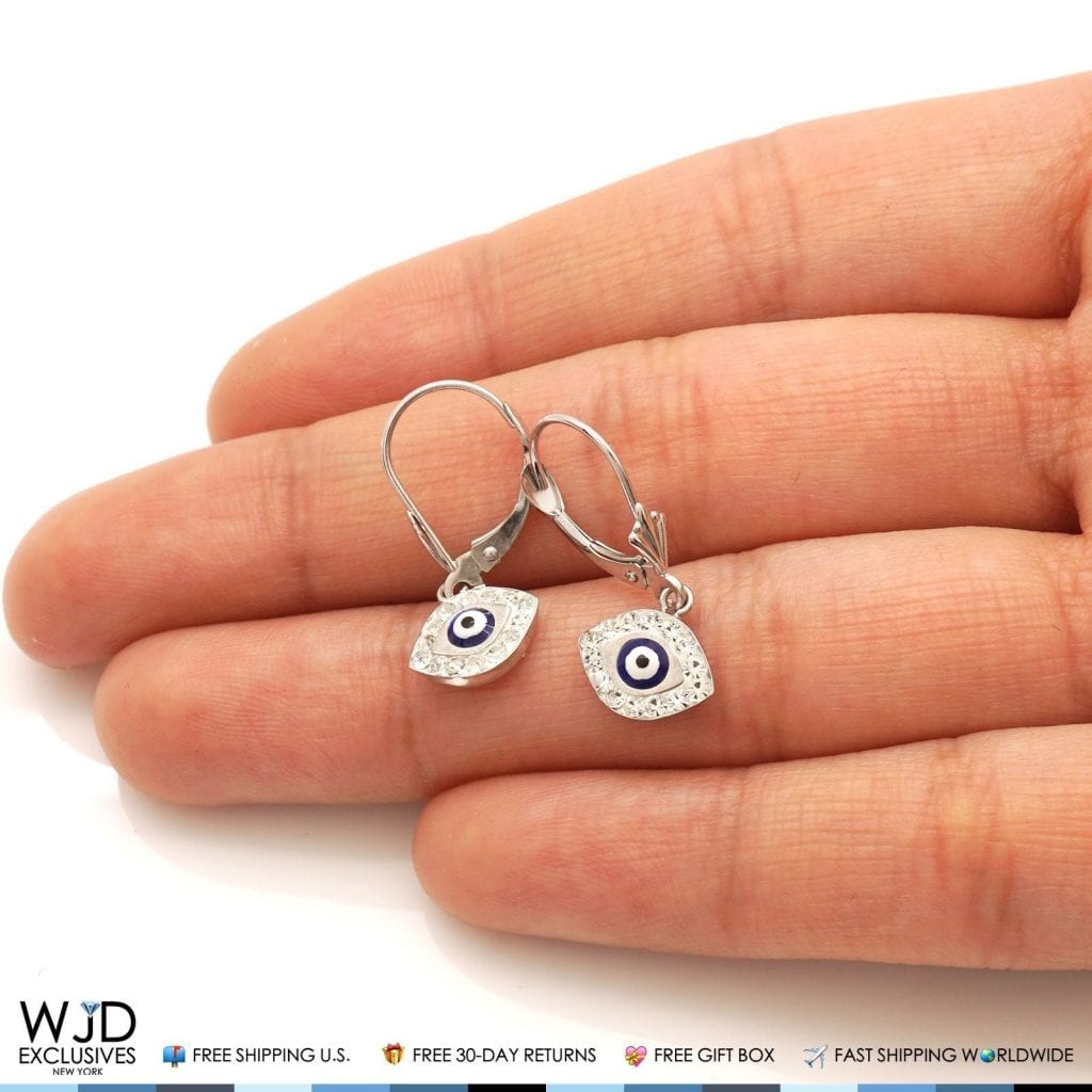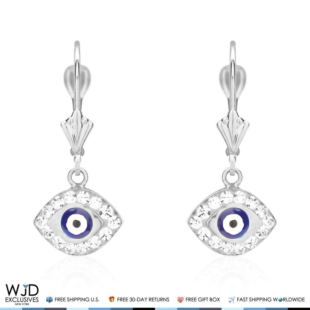 14K White Gold CZ Blue Evil Eye Dangle Leverback Earrings 1"Couldn't load pickup availability
