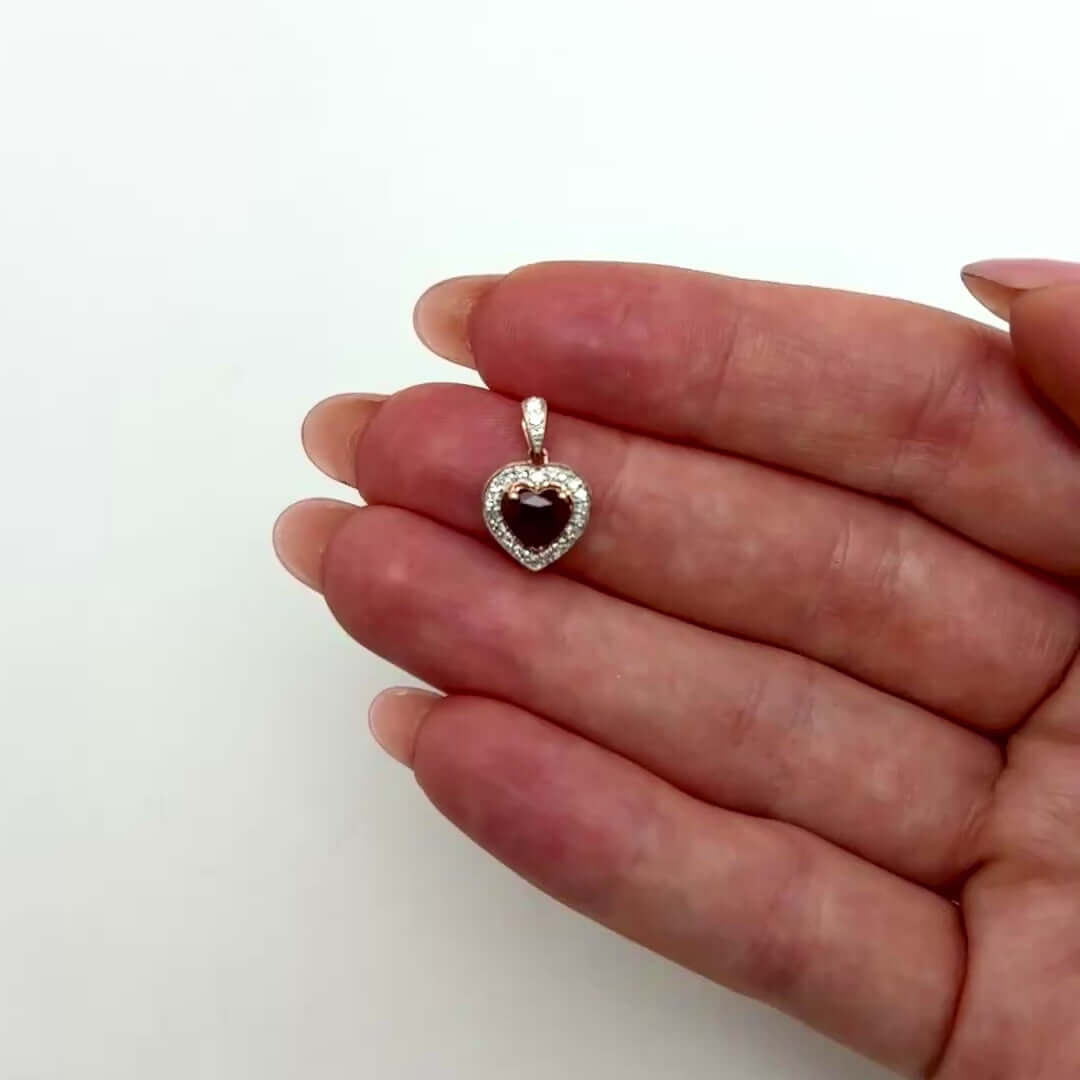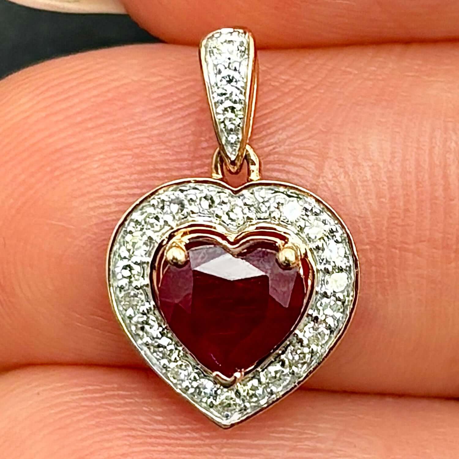 This 10K rose gold pendant features a heart-shaped design with a vibrant natural ruby at the center, surrounded by a halo of sparkling natural diamonds. Measuring 0.5" in height, it combines a warm rose gold finish with a total of 0.62 CTW in stones, creating a romantic and elegant look. Perfect for wearing alone or layered. Chain is not included. Bail clearance fits up to 3mm chains.
