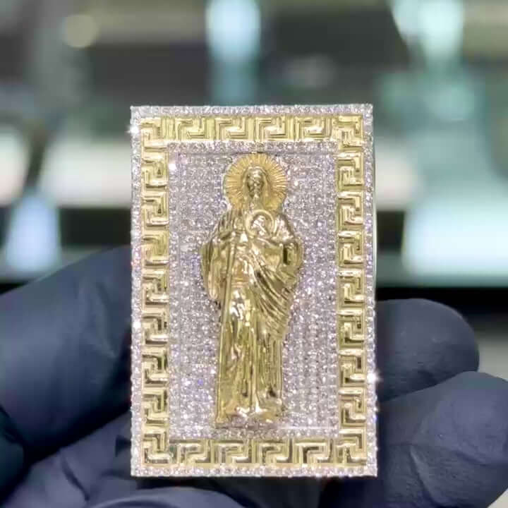 This bold 10K yellow gold signet ring features St. Jude surrounded by a brilliant display of natural round diamonds totaling approx. 1.62 CTW. The diamonds, with G-H color and I2 clarity, are prong-set to create a radiant frame around the saint’s image. Measuring 38mm in width and weighing approx. 29.1g, this high-polished piece makes a powerful statement of faith and craftsmanship. An appraisal certificate is available for purchase to confirm its authenticity and quality.