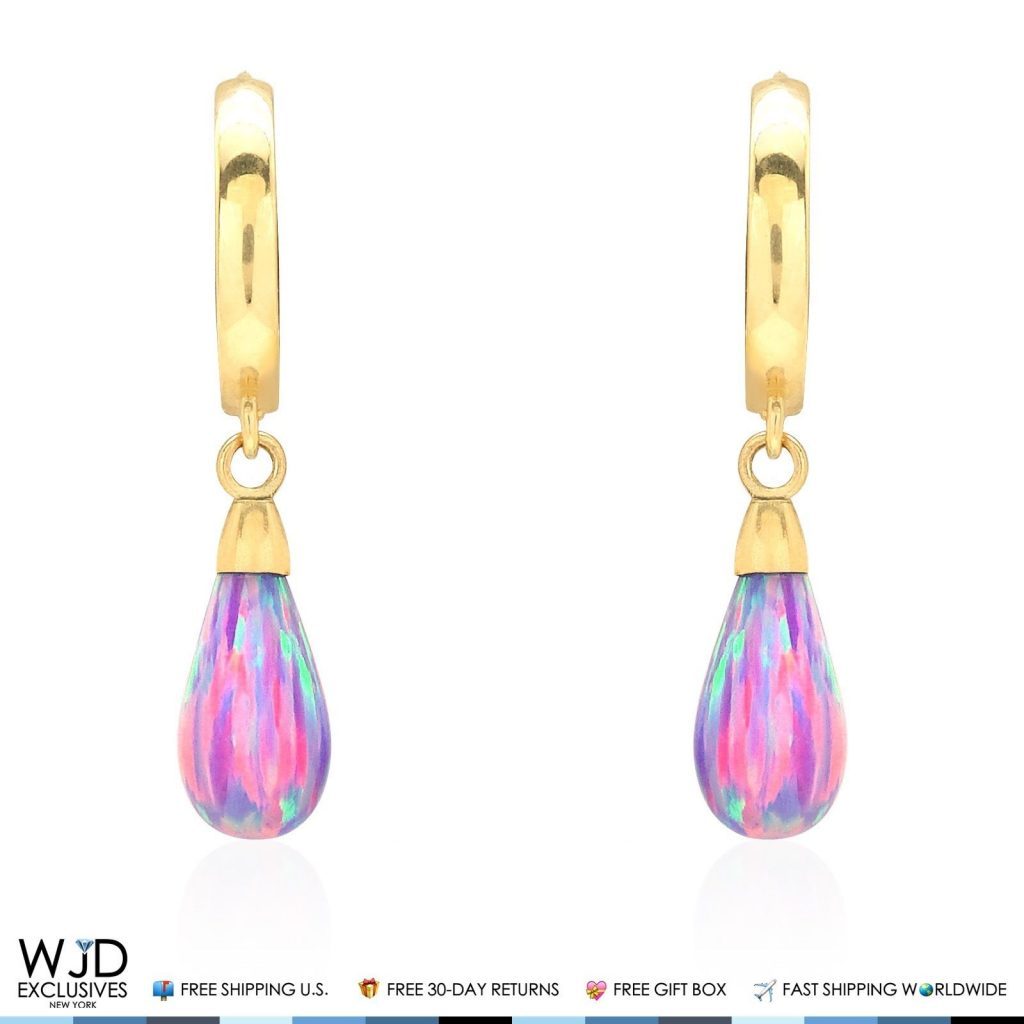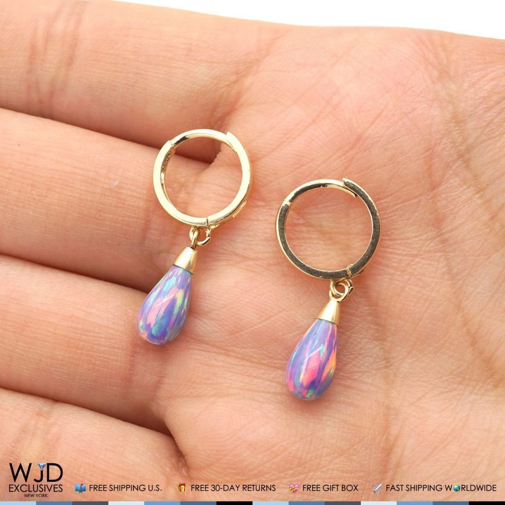 Read full return policy14K Yellow Gold Pear Shaped Purple Fire Opal Huggie Hoop Dangle Earrings