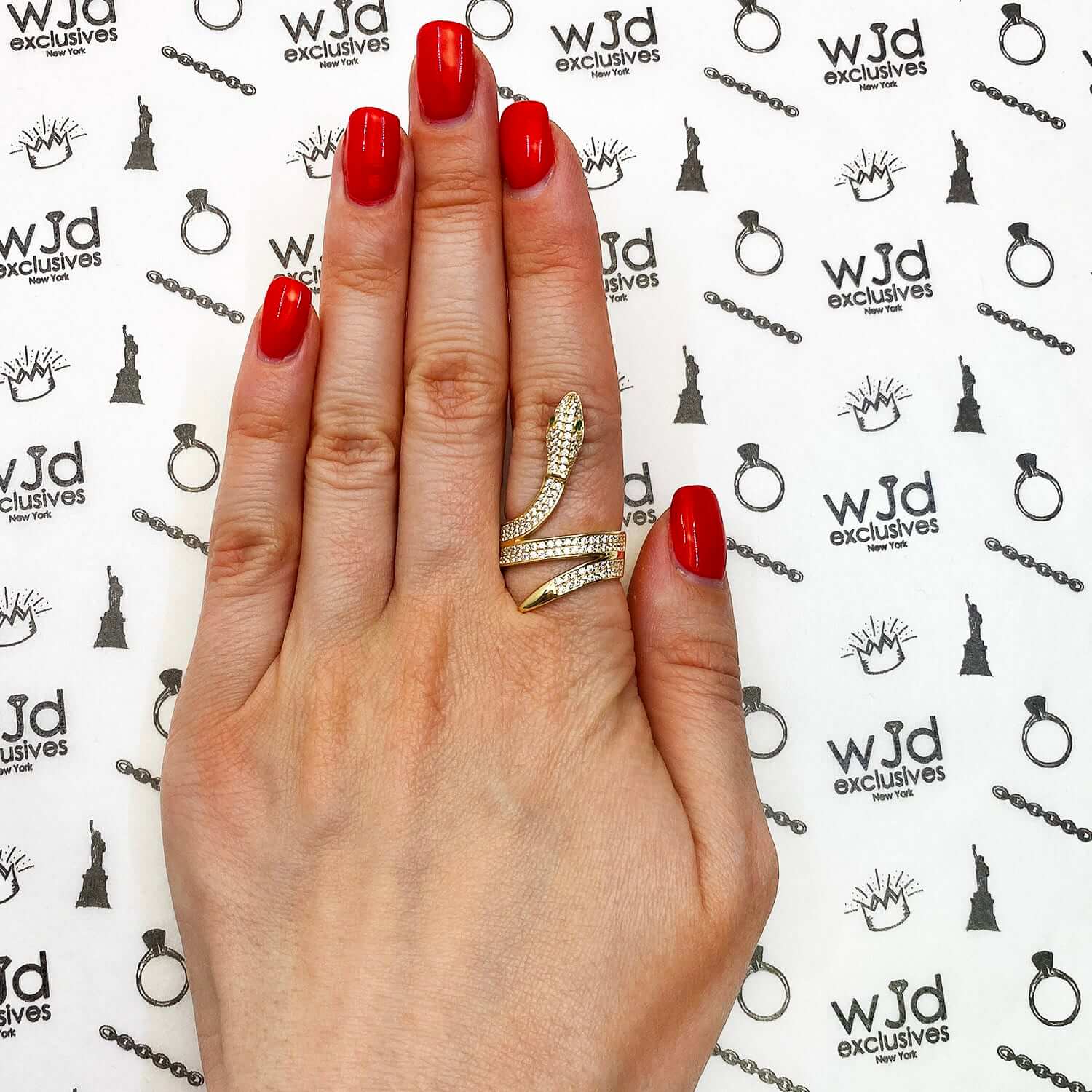 Read full return policy14K Yellow Gold 3.8CTW CZ Pave Emerald Green Eyes Snake Ring