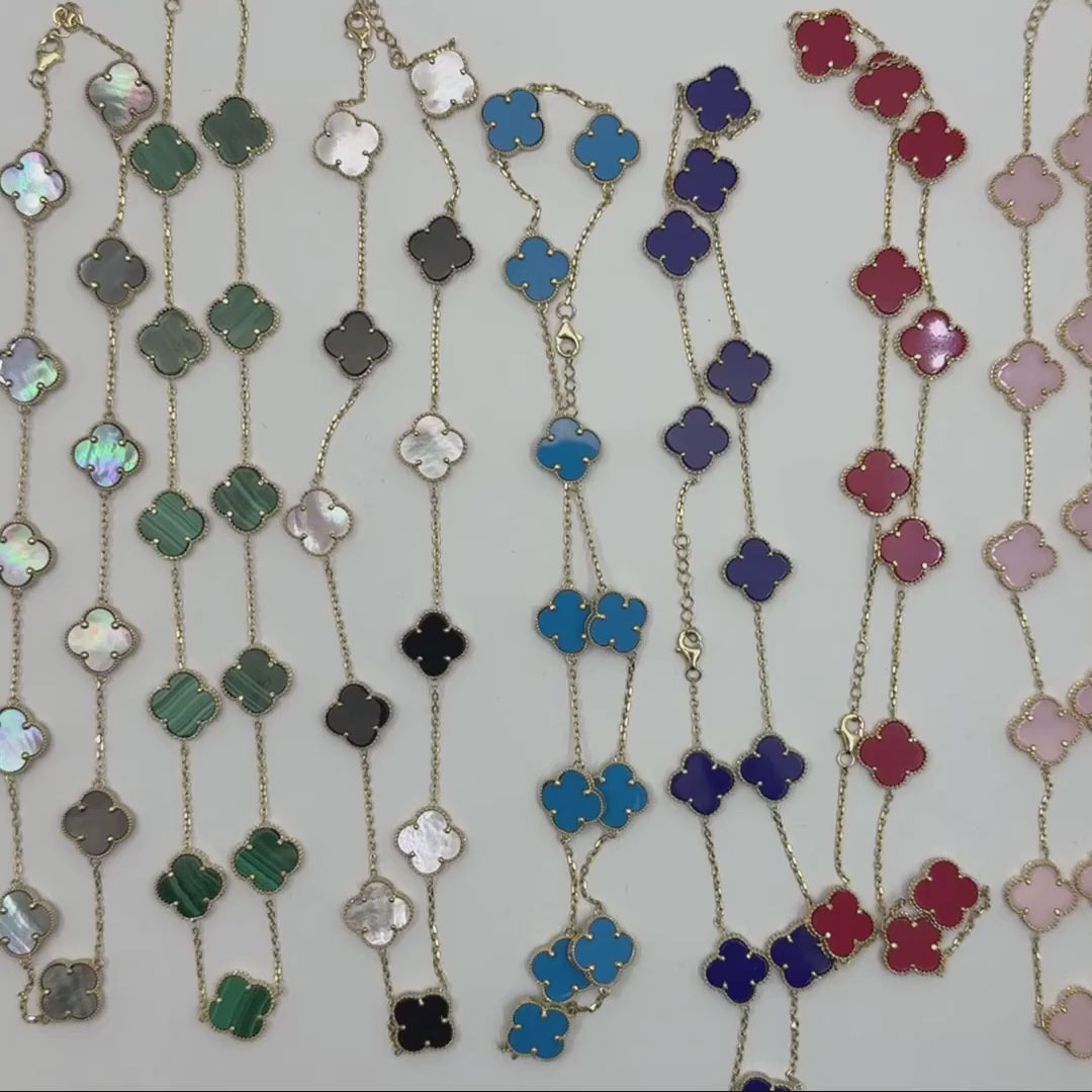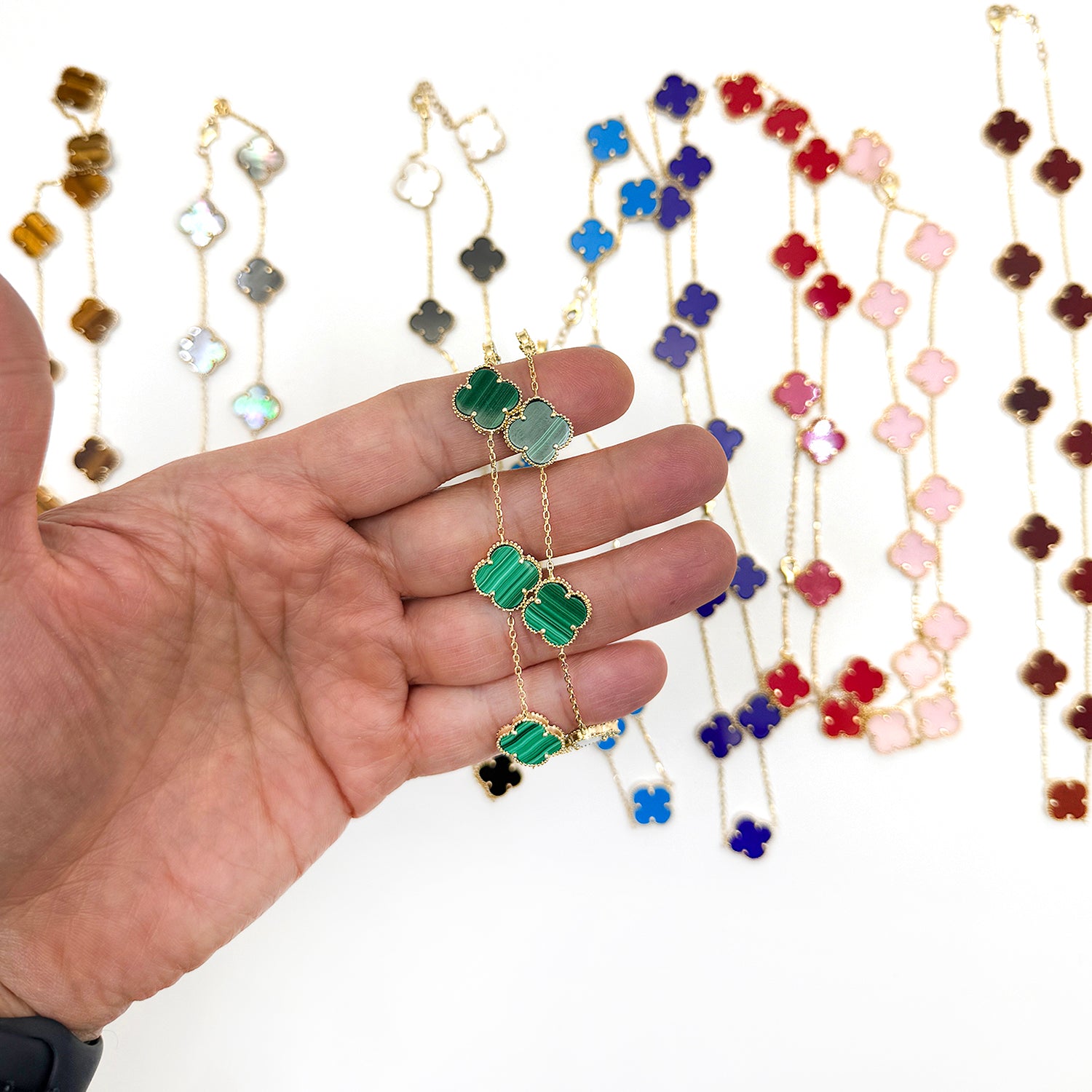 Natural gemstones: Turquoise, Malachite, Tiger’s Eye, Pink Quartz, Blue Agate, Red Carnelian, Dark Red Carnelian, Black Mother of Pearl, Onyx and Mother of Pearl