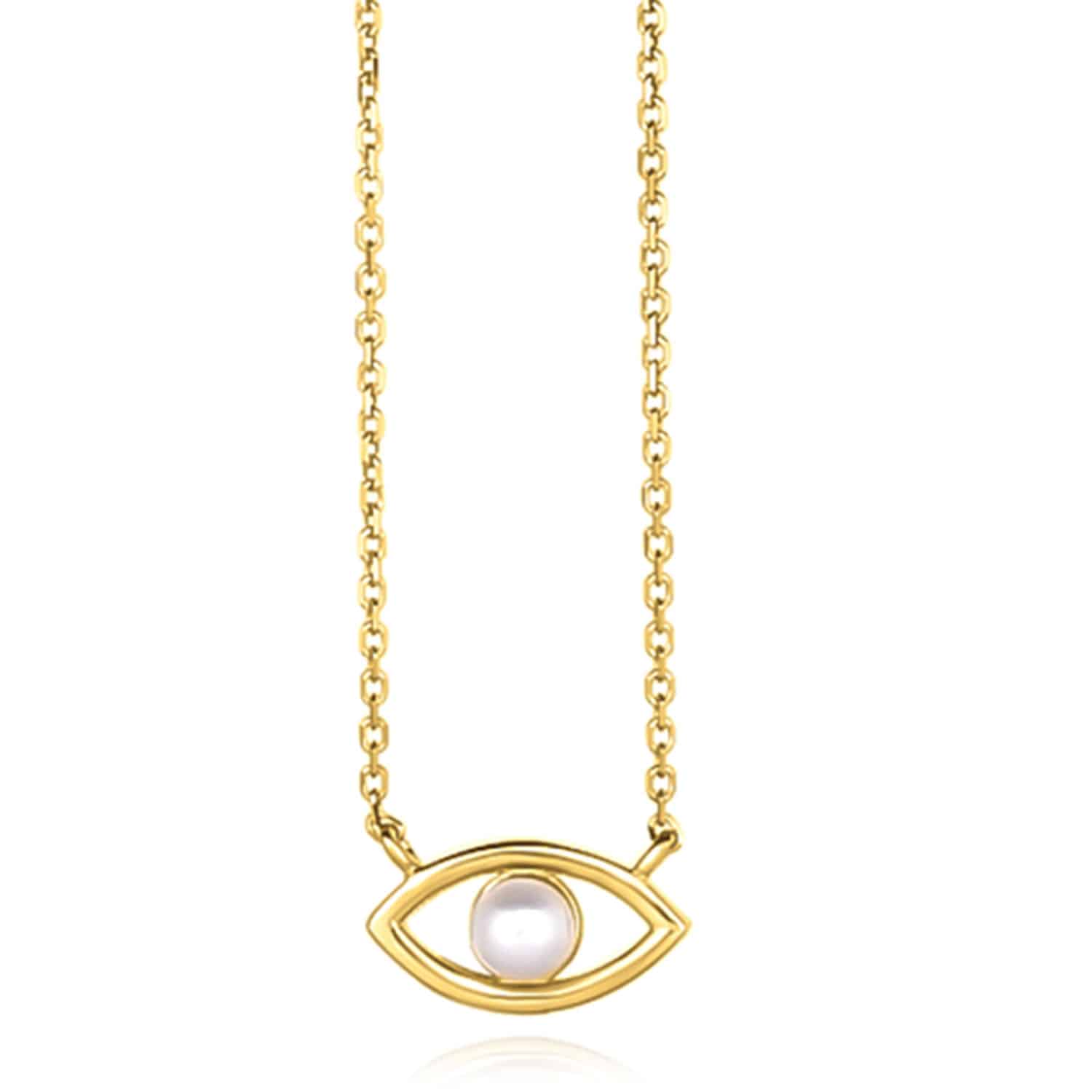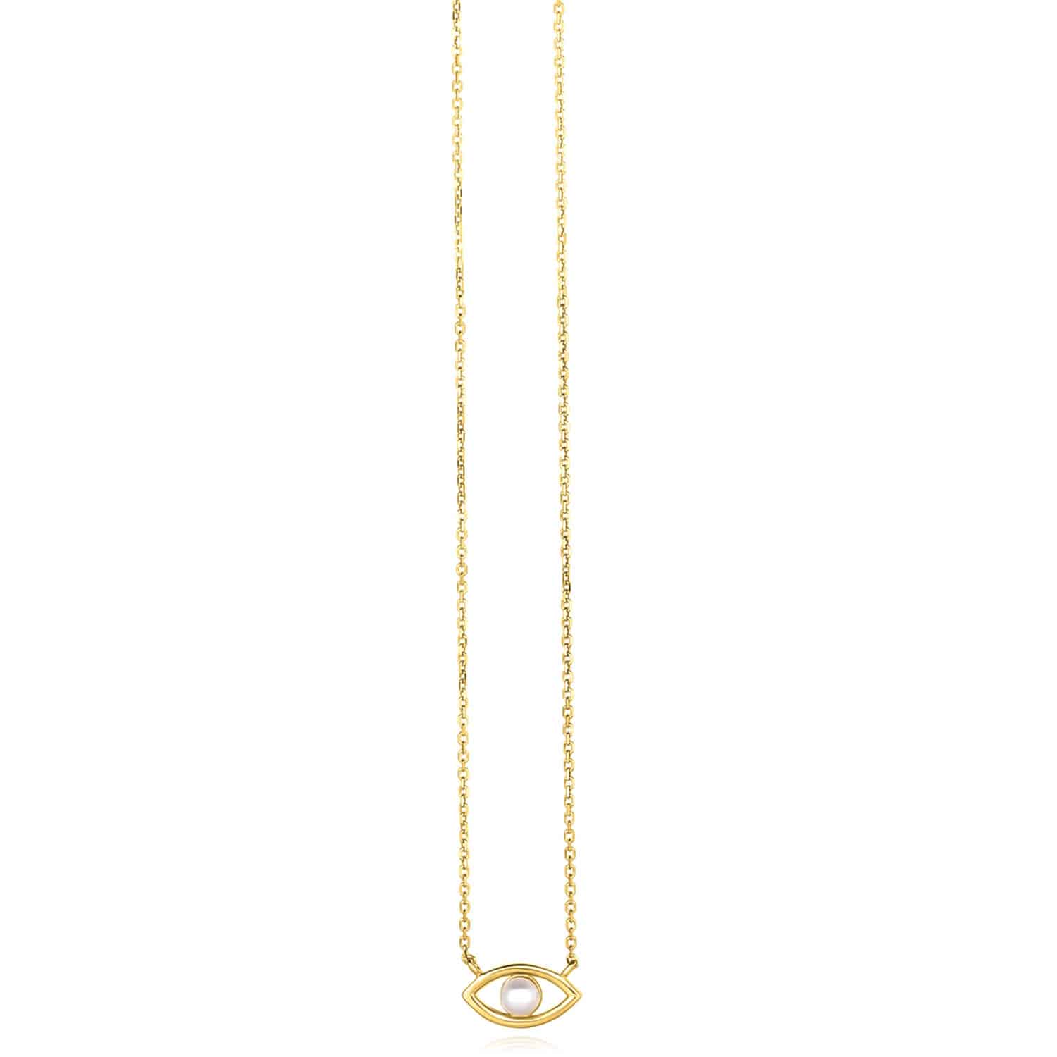 Read full return policy14K Yellow Gold Cultured Pearl Evil Eye Cable Necklace (Solid Links) 16"-18" Adjustable