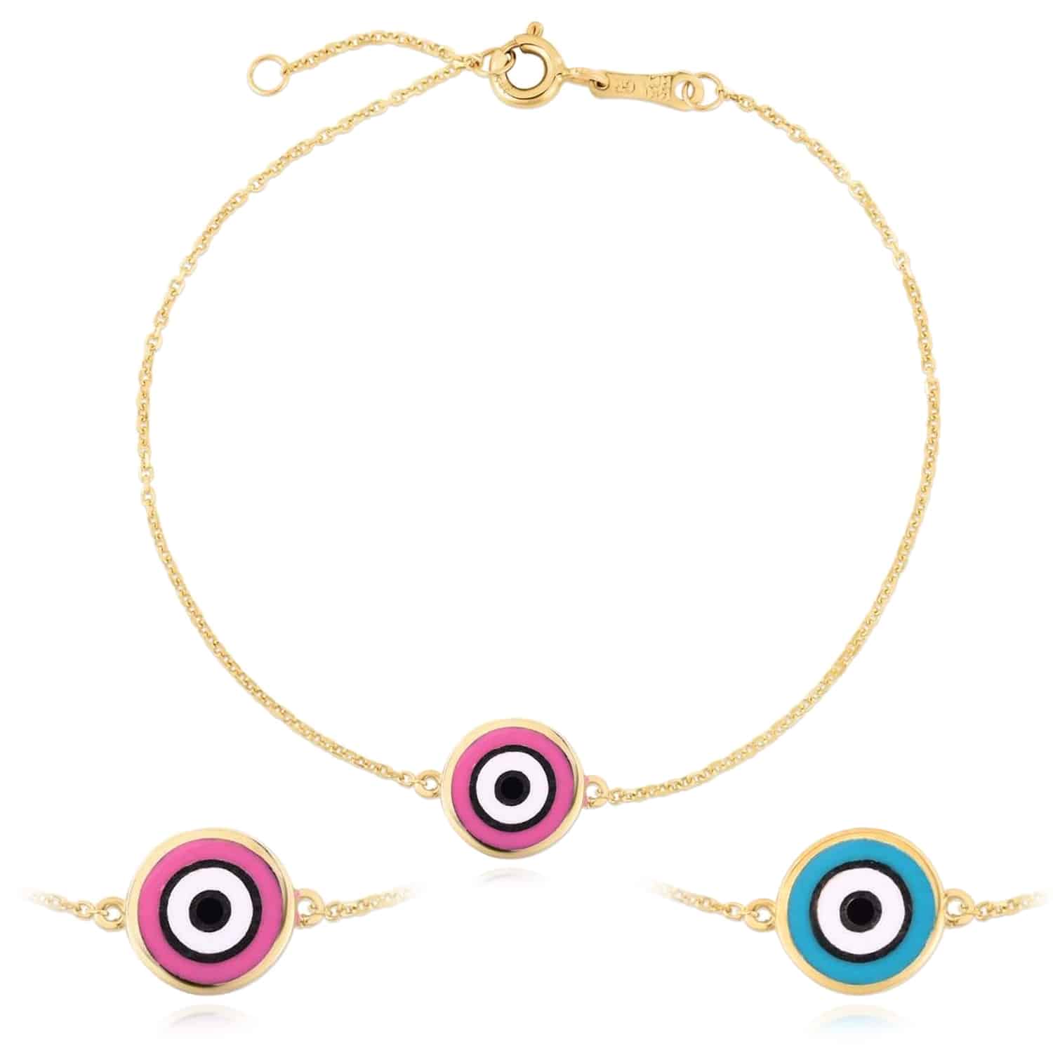 Read full return policy14K Yellow Gold Round Evil Eye Bracelet Pink Love Blue Serenity (Solid Links) 6.25"-7" Adjustable