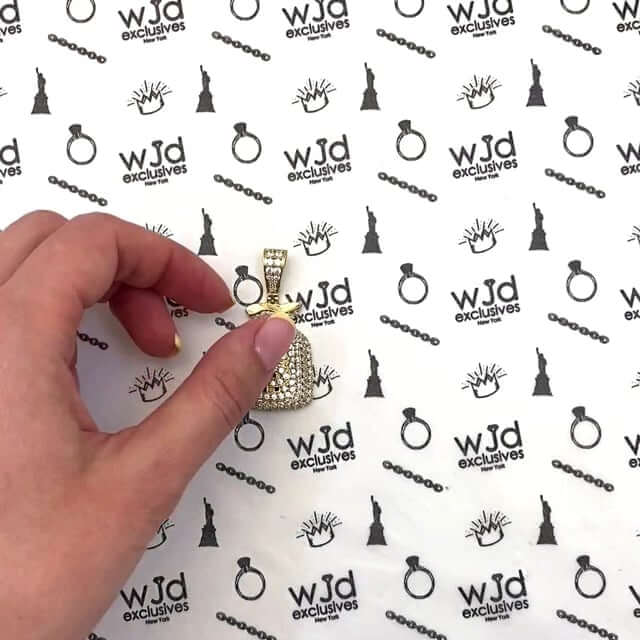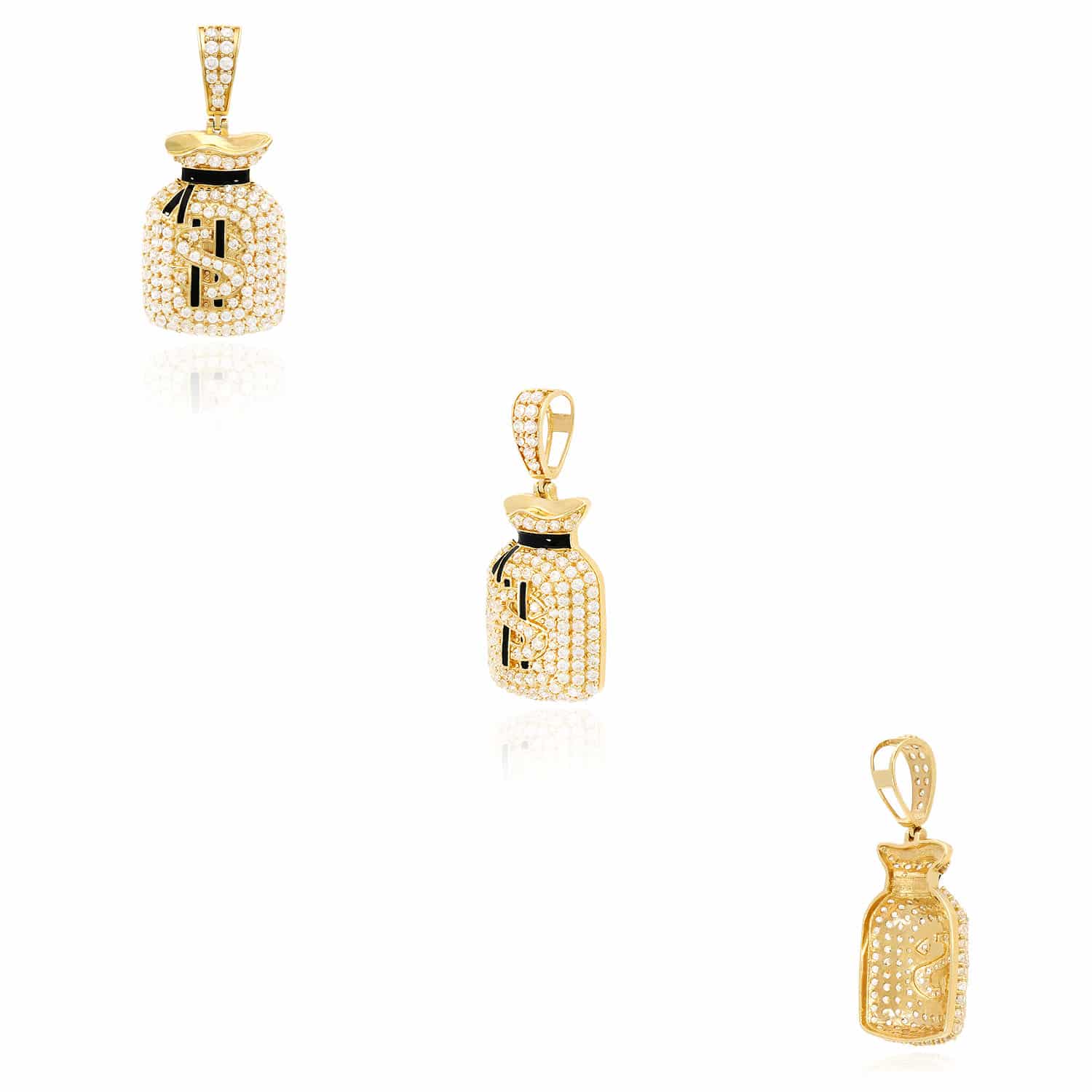 Read full return policy14K Yellow Gold CZ Black Enamel Cash Money Bag Pendant 1.8"