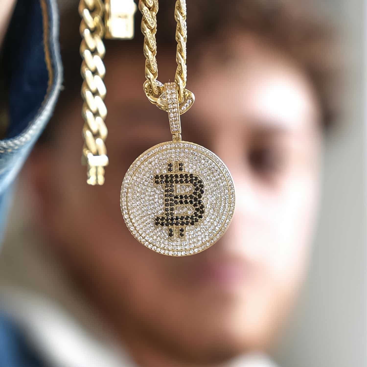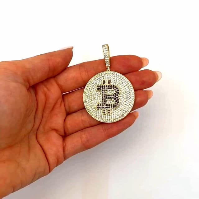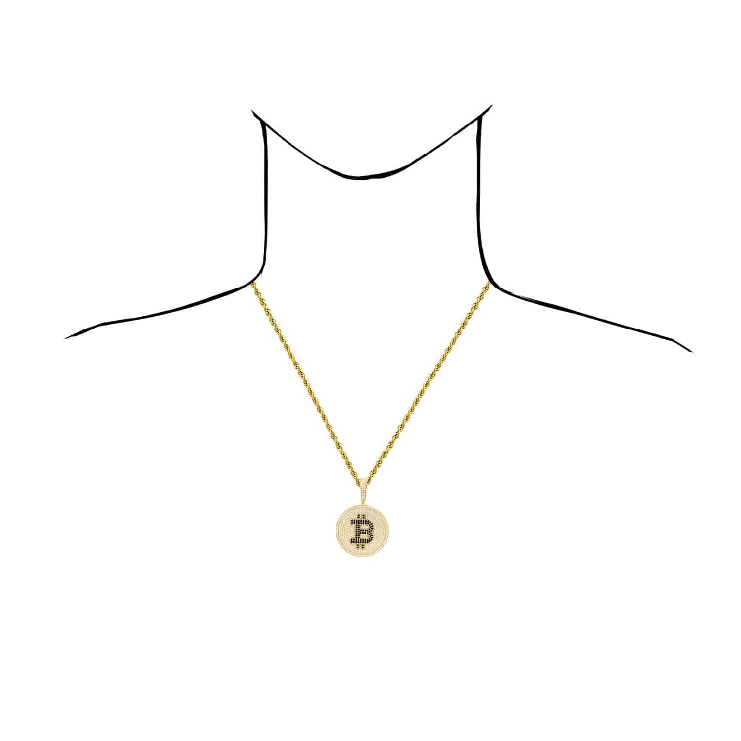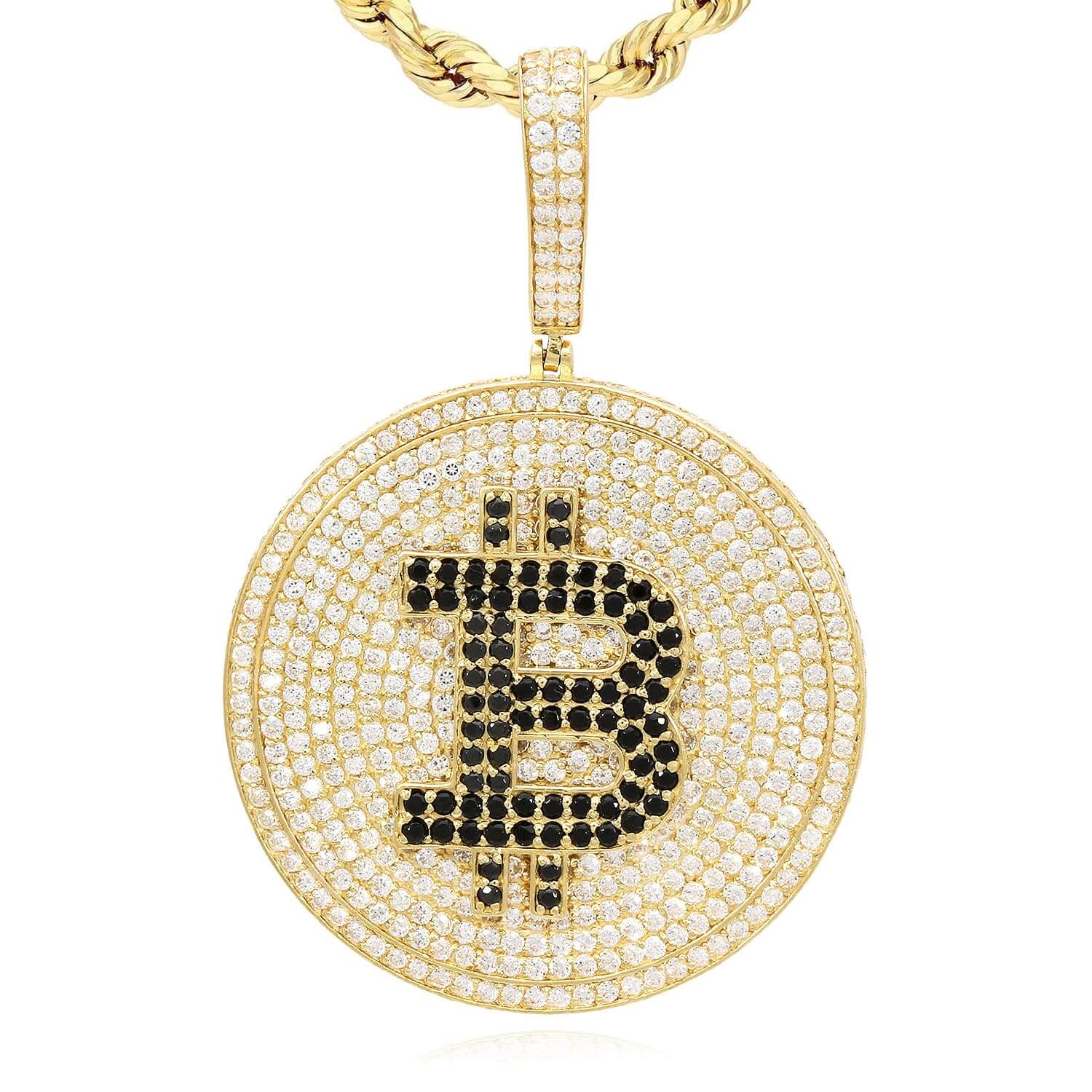 Read full return policy14K Yellow Gold CZ Black Pave Iced Bitcoin Pendant 2.1"