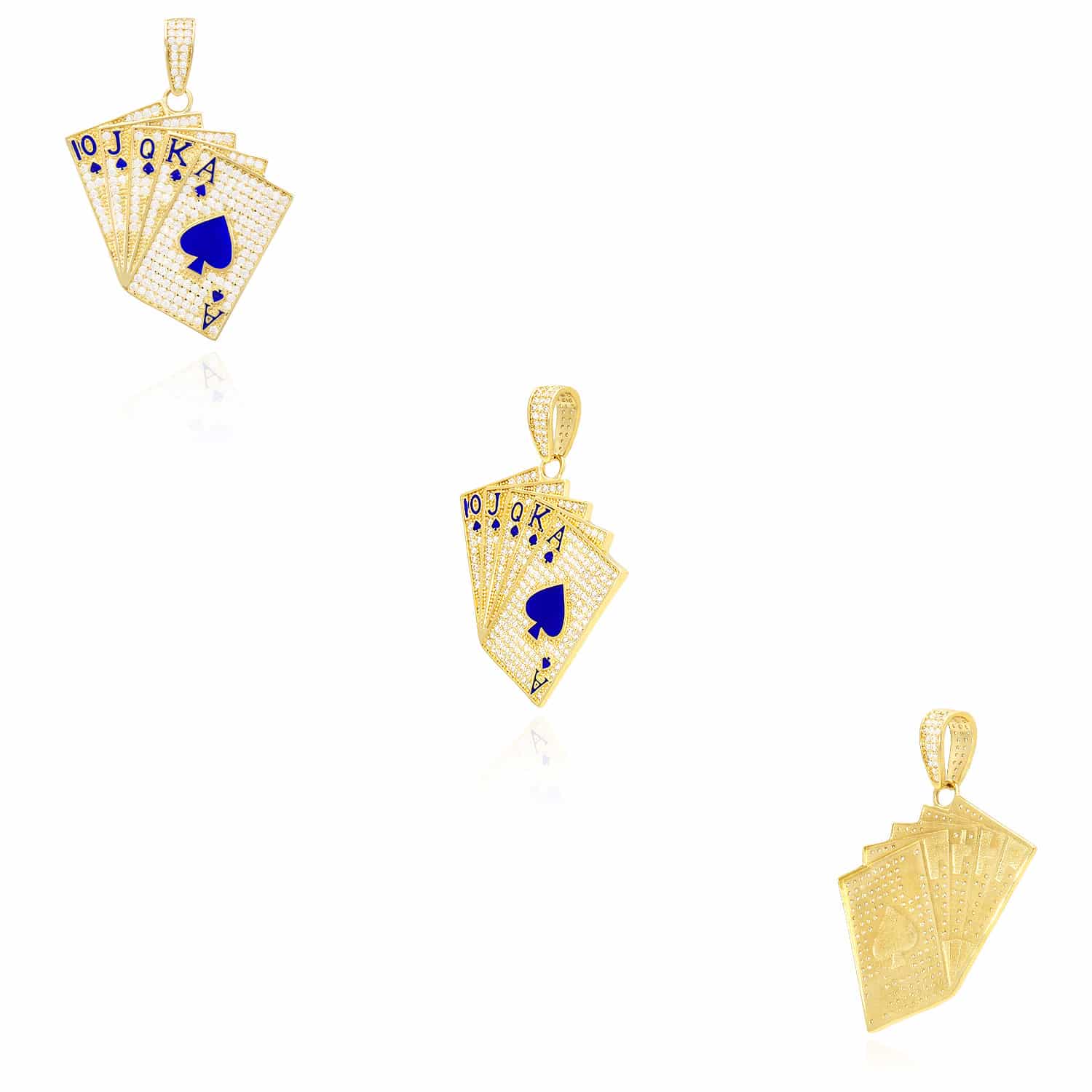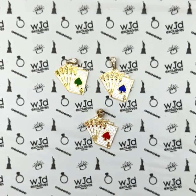 Read full return policy14K Yellow Gold CZ Blue Green Red Pave Playing Cards Pendant 1.9"
