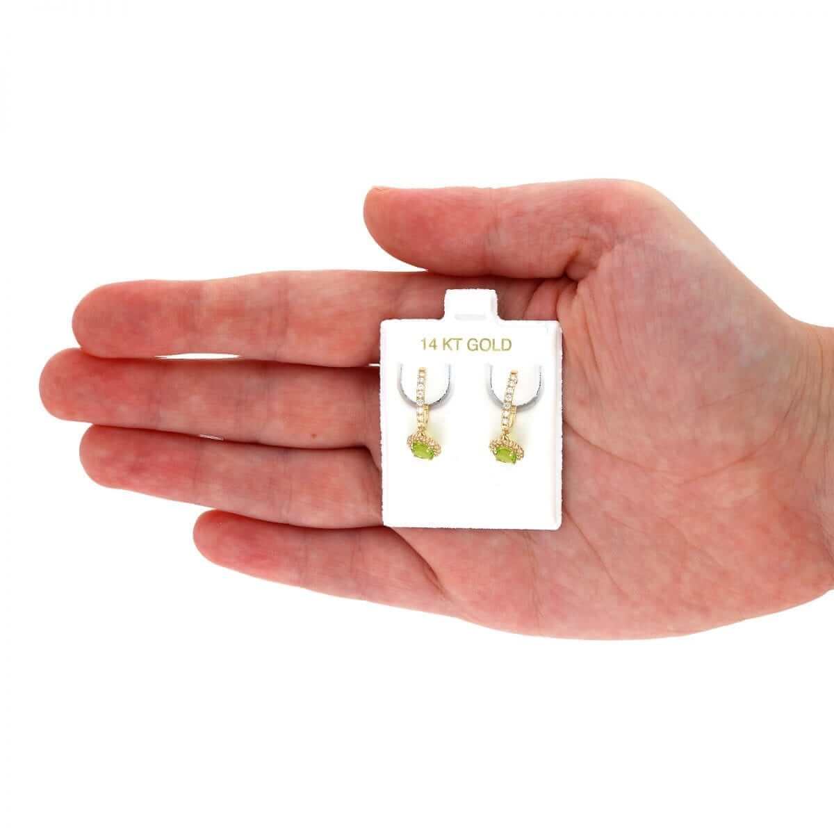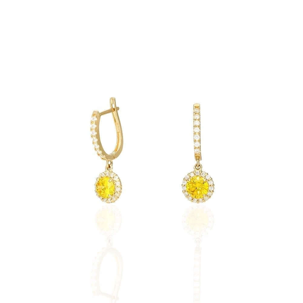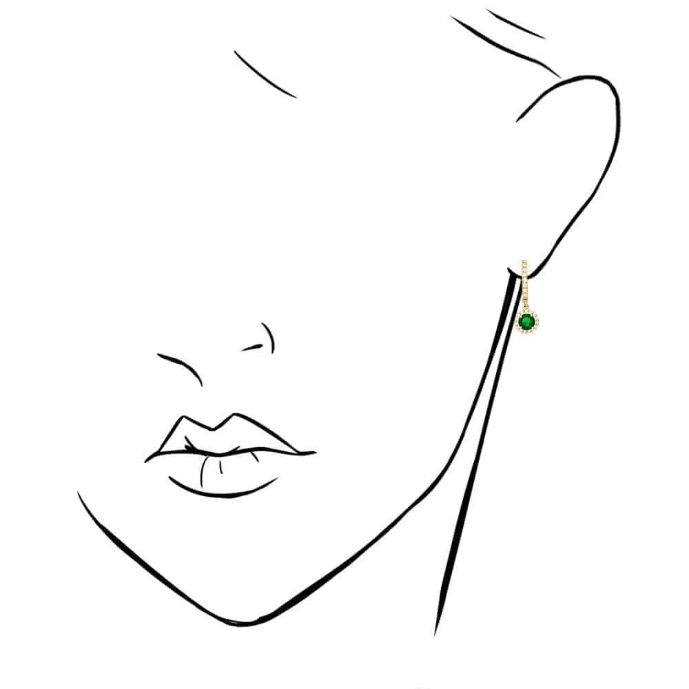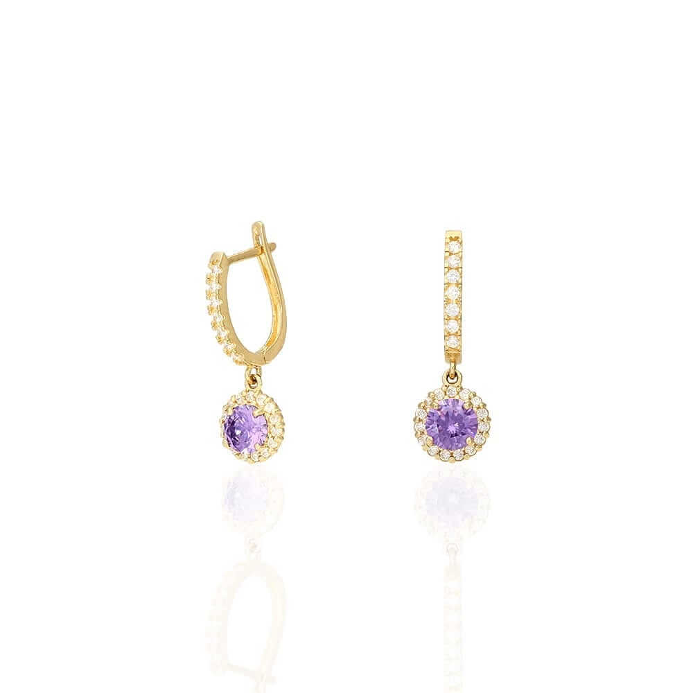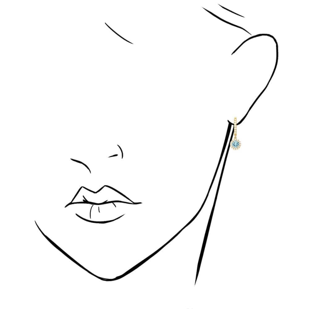 These beautiful dangle earrings are crafted from 14k yellow and white gold, featuring a round cut synthetic birthstone of your choice surrounded by a halo of round cut synthetic white diamonds totaling 1.20 Ct. They have a high polished finish and are secured with hinged snapback closures for comfortable wear.