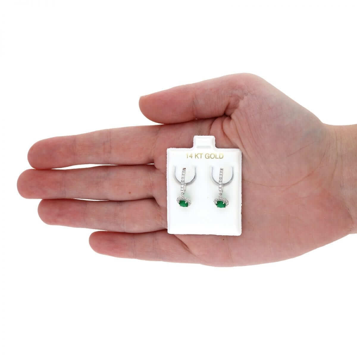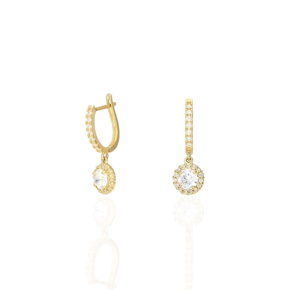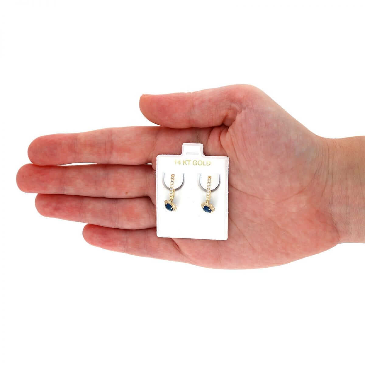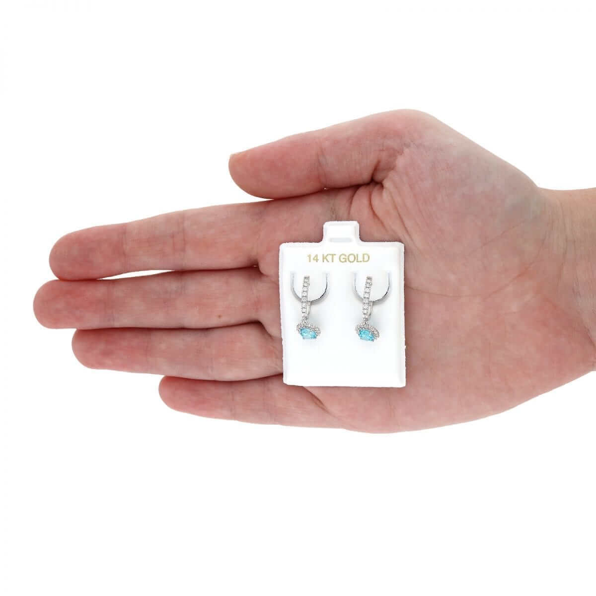 These beautiful dangle earrings are crafted from 14k yellow and white gold, featuring a round cut synthetic birthstone of your choice surrounded by a halo of round cut synthetic white diamonds totaling 1.20 Ct. They have a high polished finish and are secured with hinged snapback closures for comfortable wear.