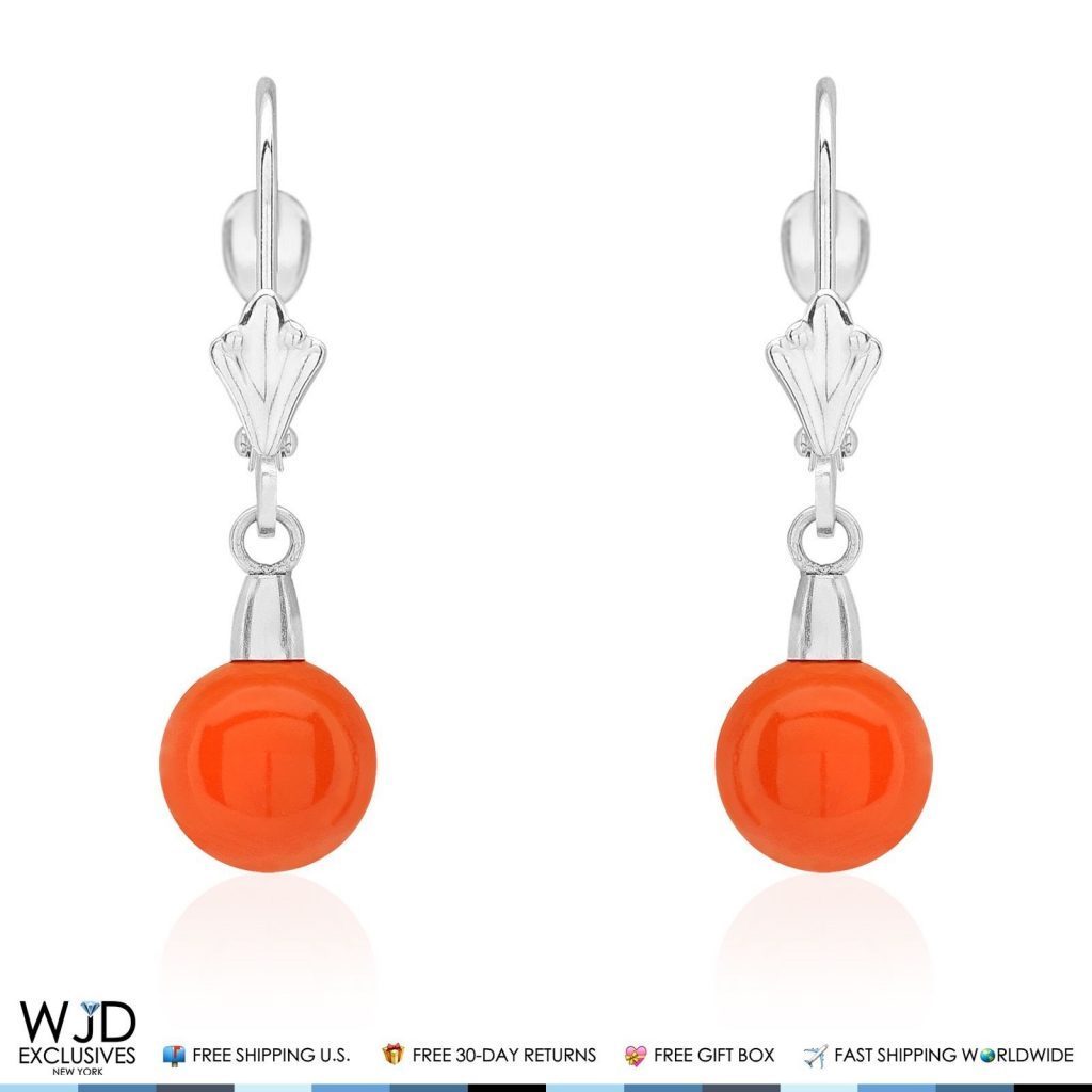 7mm Ball Orange Coral Leverback Dangle Earrings 14K White GoldCouldn't load pickup availability