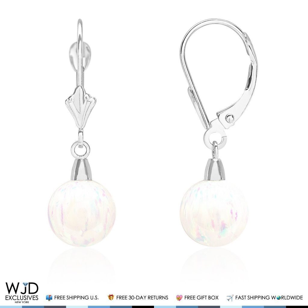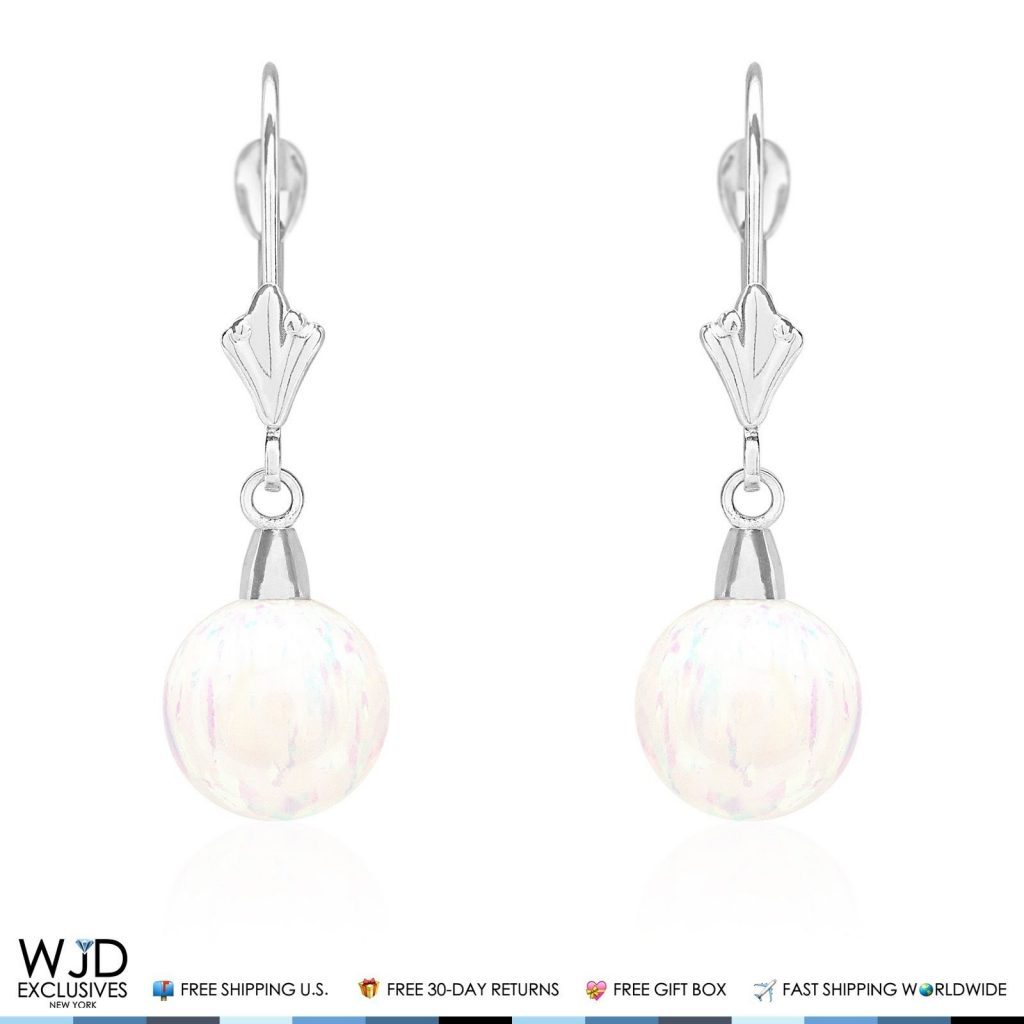 9mm Ball Shaped White Fire Opal Leverback Dangle Earrings 14K White GoldCouldn't load pickup availability