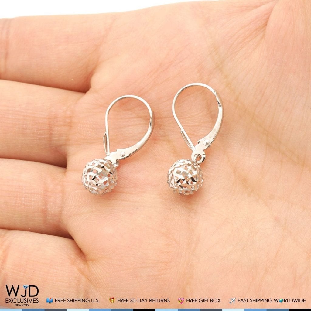 14K White Gold Carved Ball Diamond-Cut Dangle Drop Lever Back Earrings