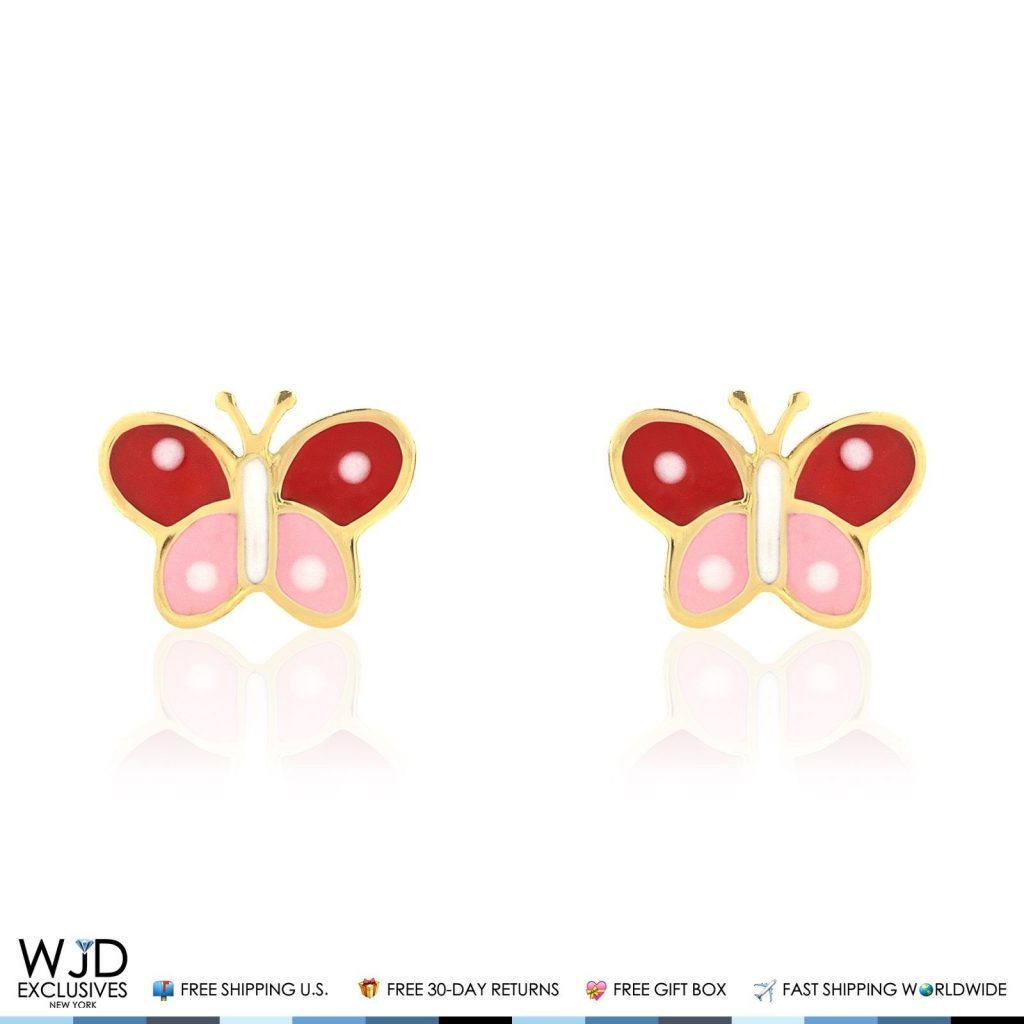 Kids 14K Yellow Gold Pink & Red Enamel Butterfly Screw Back Stud EarringsCouldn't load pickup availability
