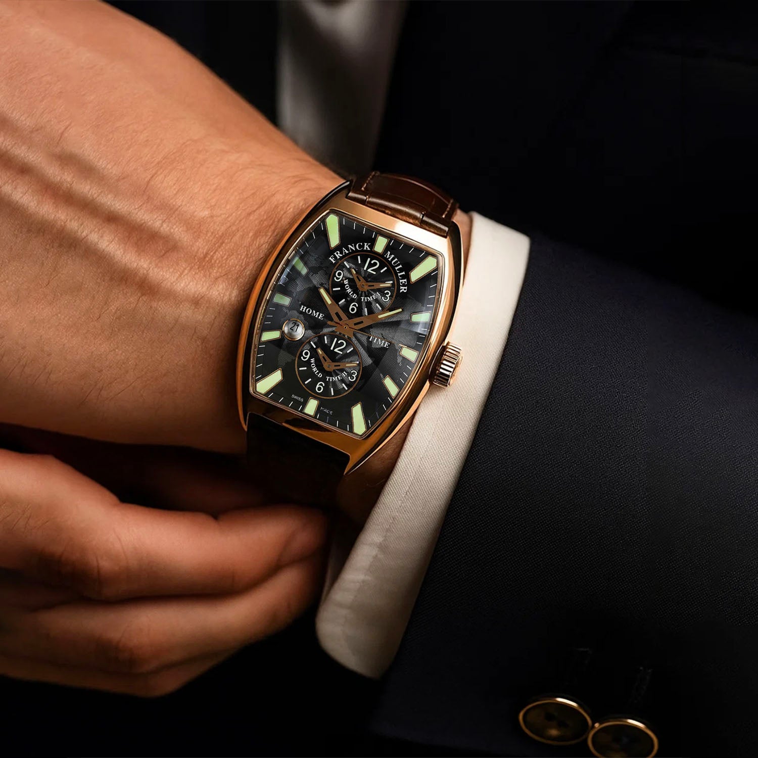 Experience timeless luxury with the Franck Muller Master Banker, crafted in solid 18K rose gold with a sophisticated black stick index dial. Powered by automatic movement and paired with a brown leather strap with tang buckle, this watch combines elegance and precision. Comes complete with its original box and papers for authenticity and added value.