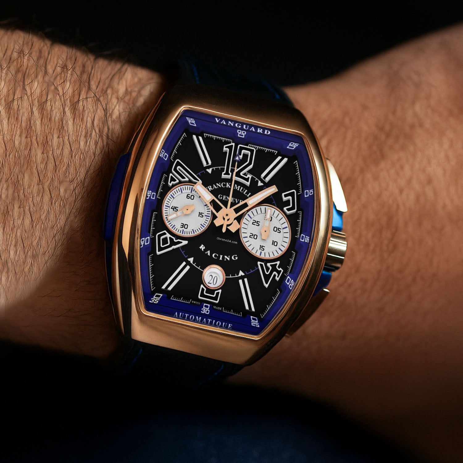 The Franck Muller Racing watch blends sporty precision with luxury craftsmanship. Featuring a 45MM 18K rose gold case, gray dial with Arabic numerals, and automatic movement, this watch comes on a black leather strap with tang buckle. Includes original box and papers for authenticity and value.