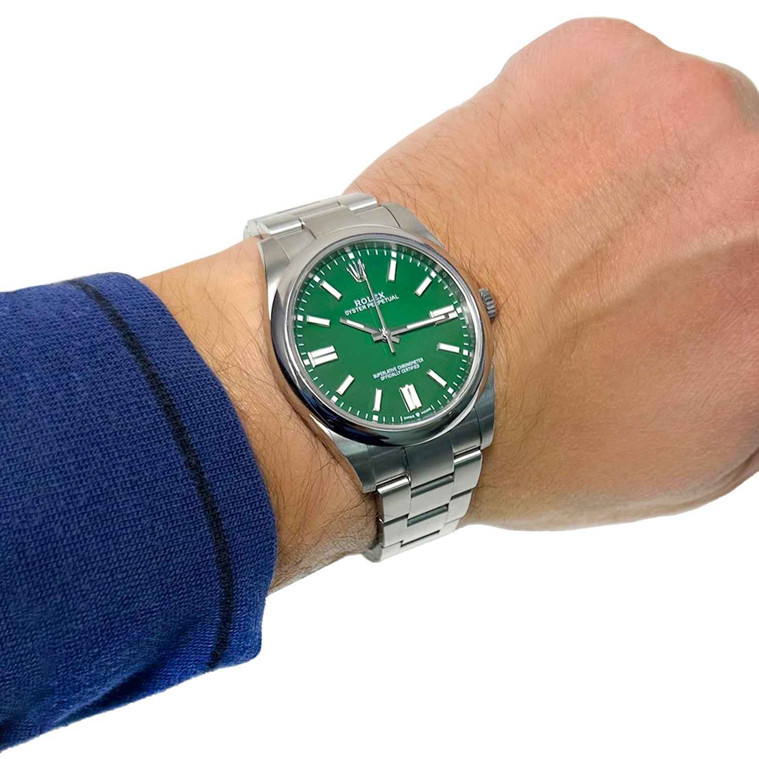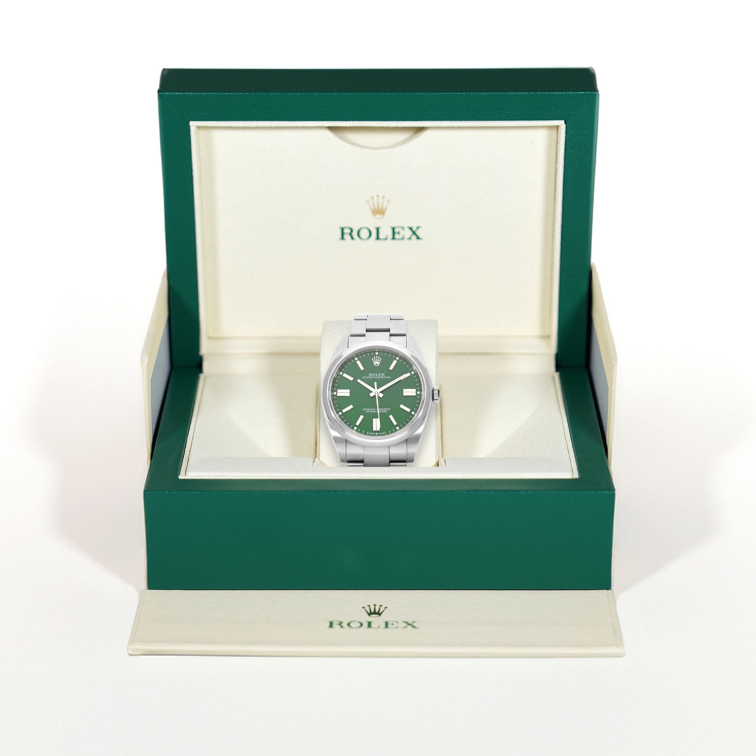 Rolex’s legendary craftsmanship meets classic form in this Oyster Perpetual men's watch, featuring a sleek 41mm stainless steel case and vibrant green dial. With a self-winding Swiss movement and 70-hour power reserve, this timepiece delivers reliable precision and timeless appeal.
