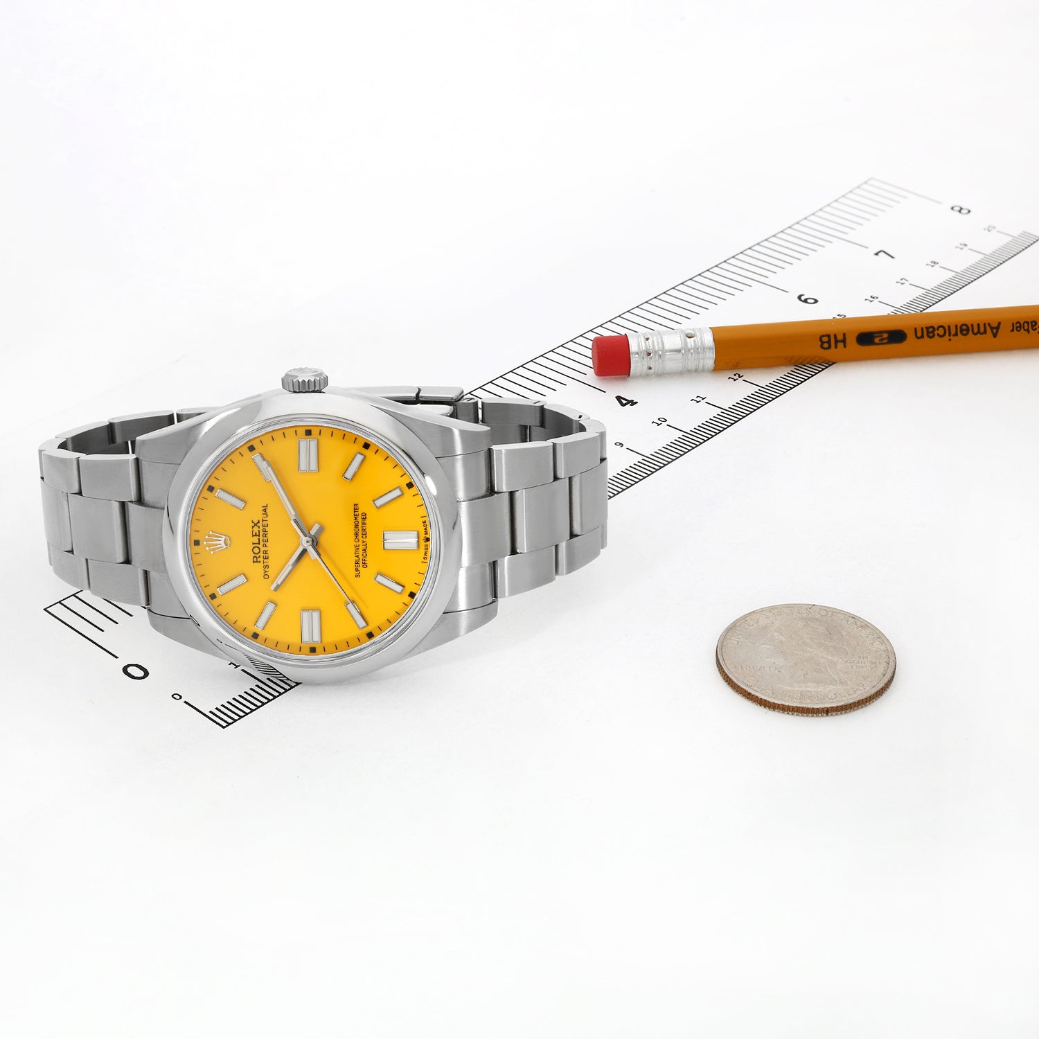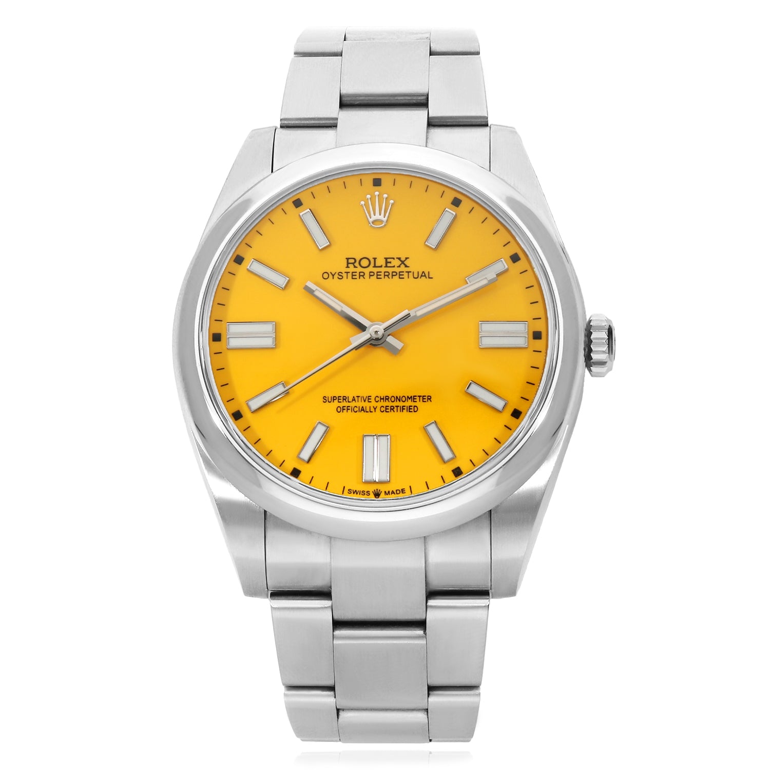 Rolex’s legendary craftsmanship meets classic form in this Oyster Perpetual men's watch, featuring a sleek 41mm stainless steel case and vibrant yellow dial. With a self-winding Swiss movement and 70-hour power reserve, this timepiece delivers reliable precision and timeless appeal.