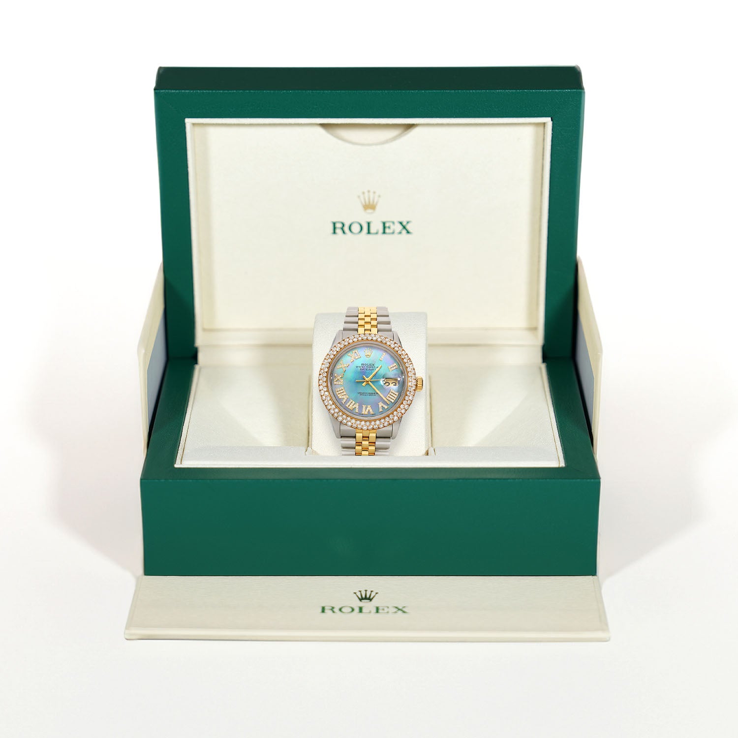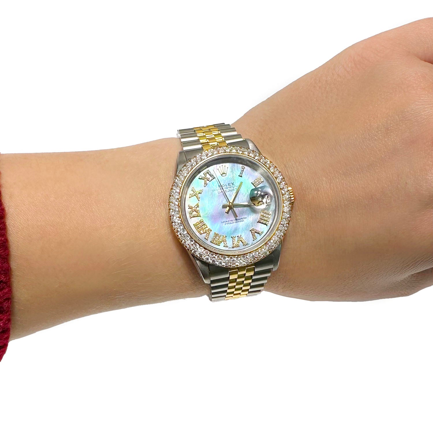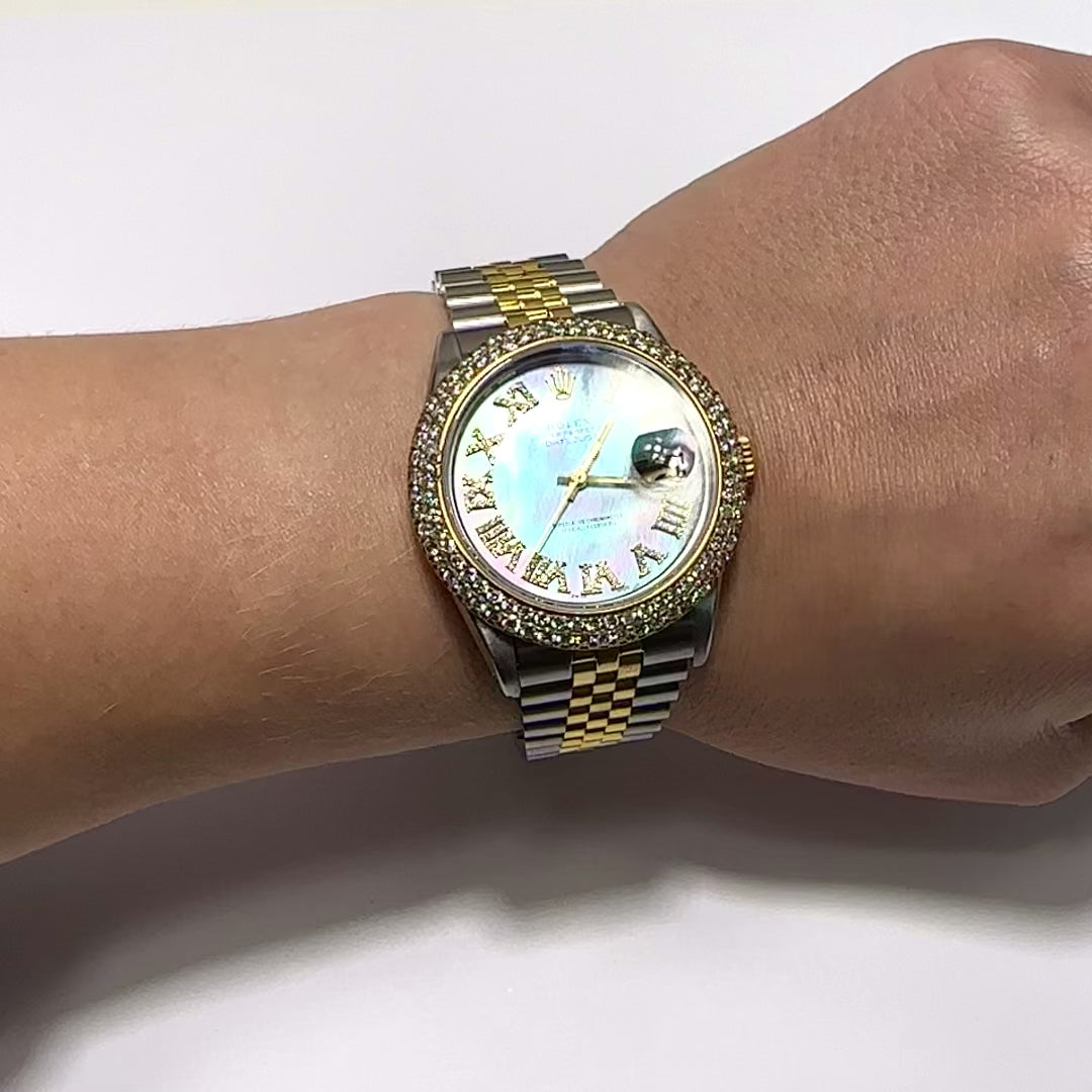 This Rolex Datejust showcases a custom diamond bezel, a sky-blue dial with diamond Roman numerals, and a two-tone Jubilee band. With a 36mm stainless steel case, high-polished finish, and self-winding movement, it's a timeless watch with a touch of elegance. This pre-owned Rolex Datejust comes from our inventory and it's always kept clean and ready for wear. This example is in immaculate condition and the bracelet straps have been lightly polished to retain the original finish. This Rolex was released in the 1990s. Fits wrists up to 7.25 inches with removable links. Additional links are available for purchase to extend the bracelet.