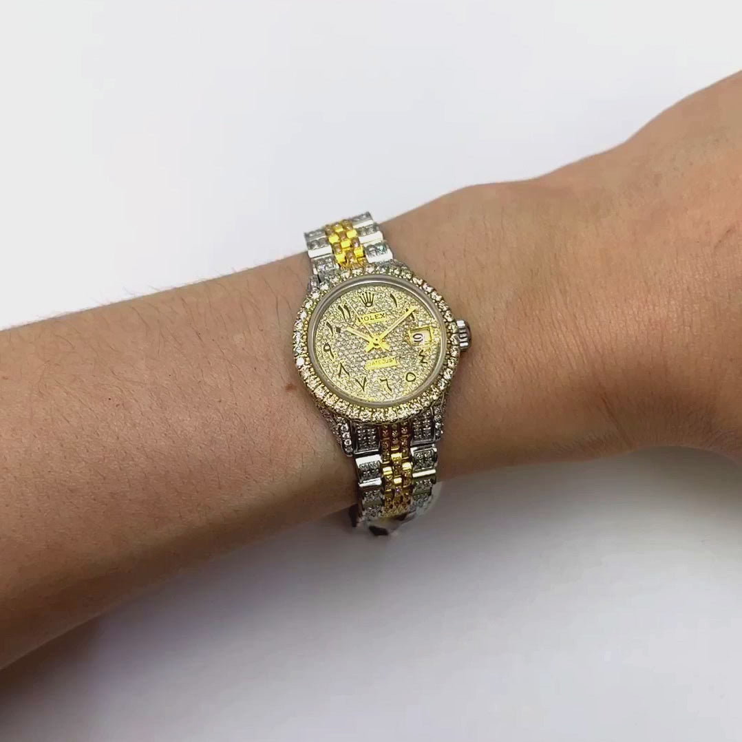 This pre-owned Rolex Datejust 26mm watch features a stainless steel and 18K yellow gold case with a custom diamond pave bezel and dial. The yellow face displays diamond Arabic numerals and is paired with a certified aftermarket Jubilee bracelet. It comes with the original box and certification, making it a standout addition to any luxury collection. Please note: custom diamond work renders the watch non-waterproof. Handle with care. All specifications are approximate.
