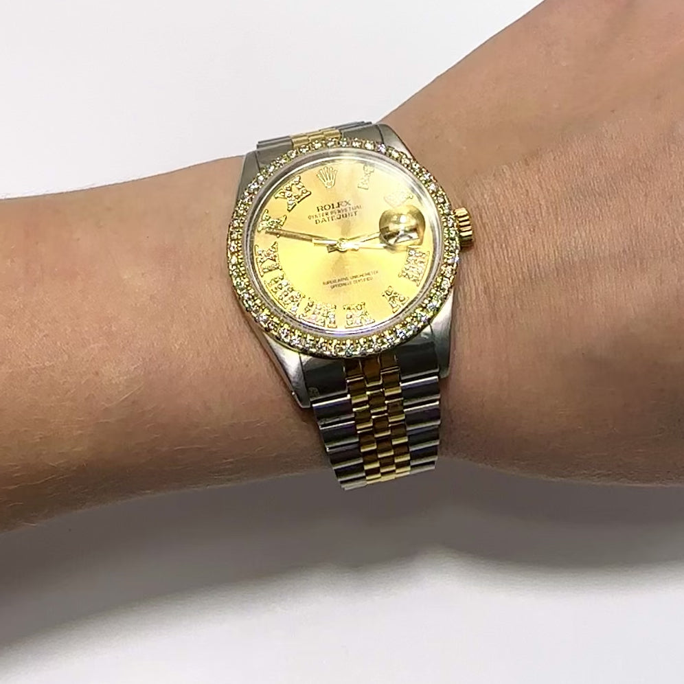 This elegant 36mm Rolex Datejust features a radiant gold dial with diamond Roman numerals, framed by a 4.50Ct diamond bezel. The two-tone stainless steel and 18K gold Jubilee bracelet adds timeless sophistication, making it a standout piece of vintage luxury. This pre-owned Rolex, released in the 1990s, is in immaculate condition. The bracelet has been lightly polished to preserve its original finish. Fits wrists up to 7.25 inches with removable links (additional links available upon request).