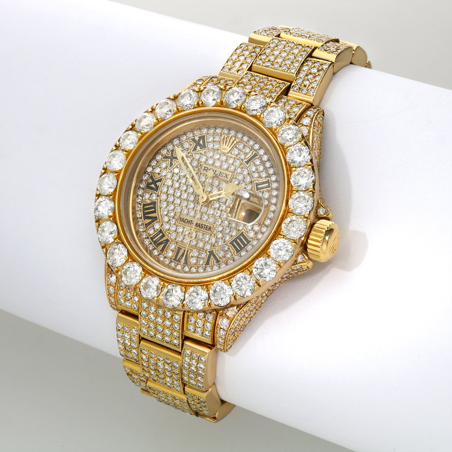 Experience the pinnacle of luxury with this pre-owned Rolex Yacht-Master, masterfully customized with 35.00 carats of natural diamonds. Crafted in solid 18K yellow gold, this Swiss-made masterpiece features a diamond pavé bezel and bracelet, offering unmatched brilliance and refined craftsmanship.