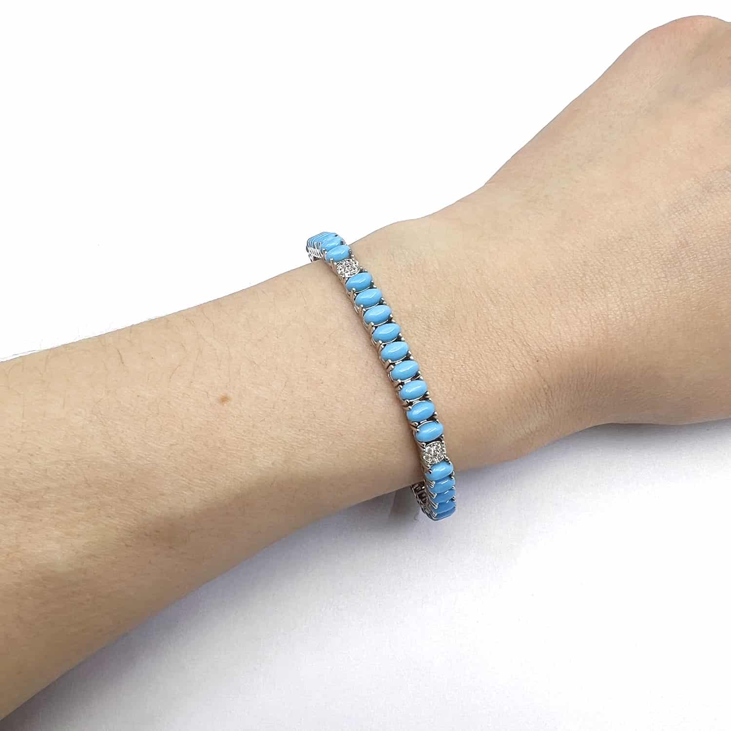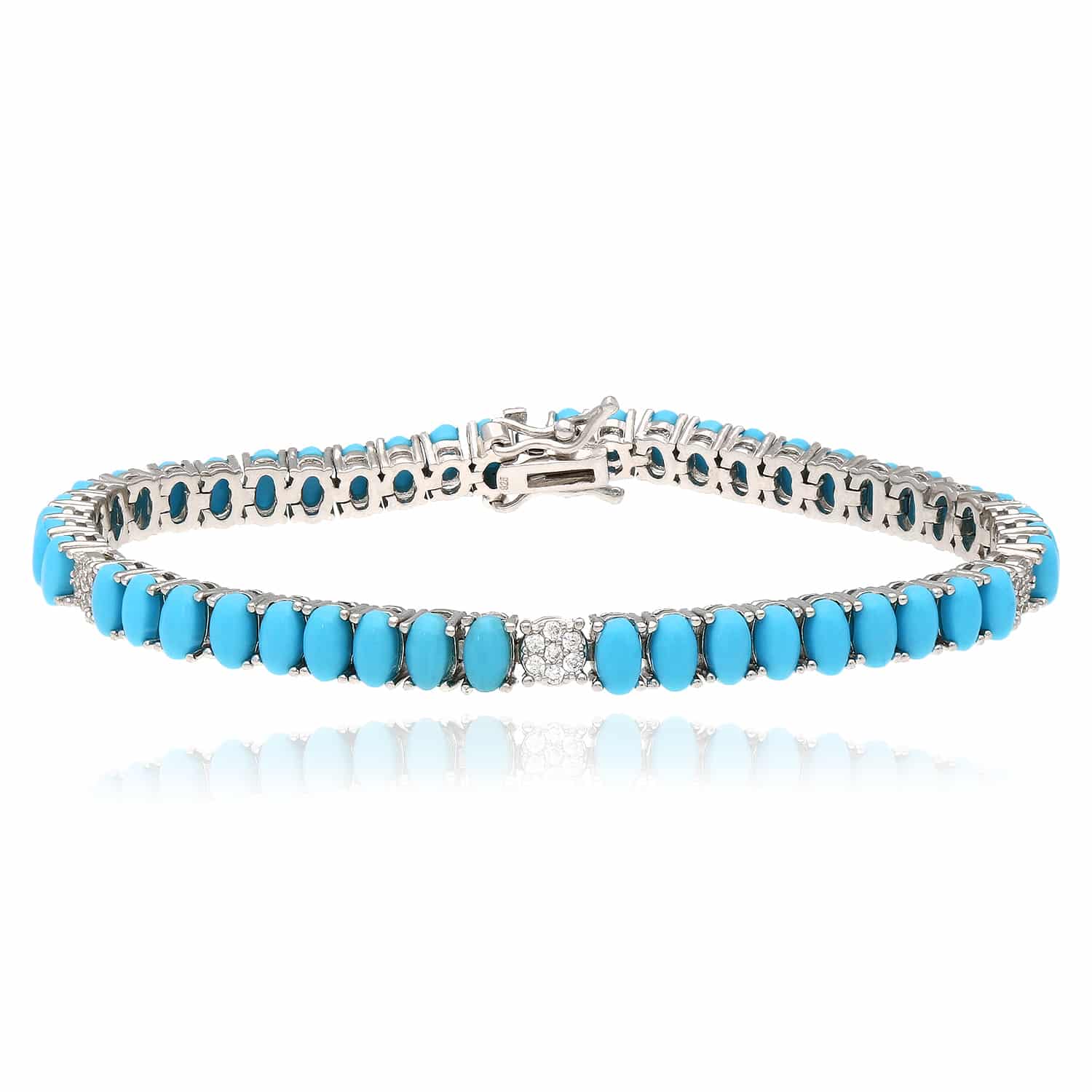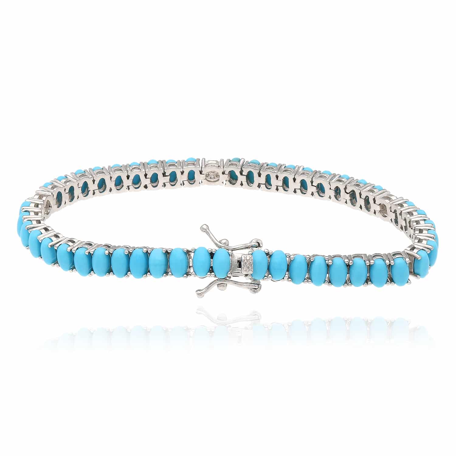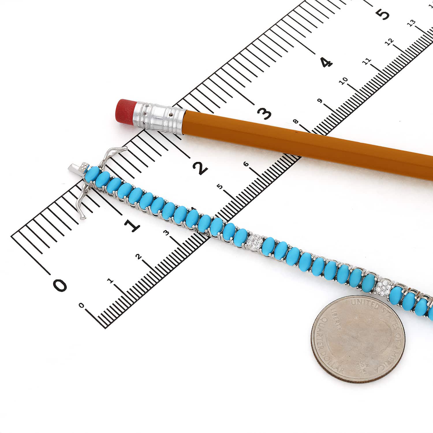 Bring a touch of the Southwest to your jewelry collection with this beautiful sterling silver tennis bracelet, featuring 5mm oval cabochon turquoise stones. Measuring 6.5 to 7 inches in length, this bracelet is perfect for layering or wearing on its own. The tennis style adds elegance, making it an ideal choice for both special occasions and everyday wear. Whether you're adding a pop of color or treating yourself, this turquoise tennis bracelet is sure to become a cherished piece of jewelry.